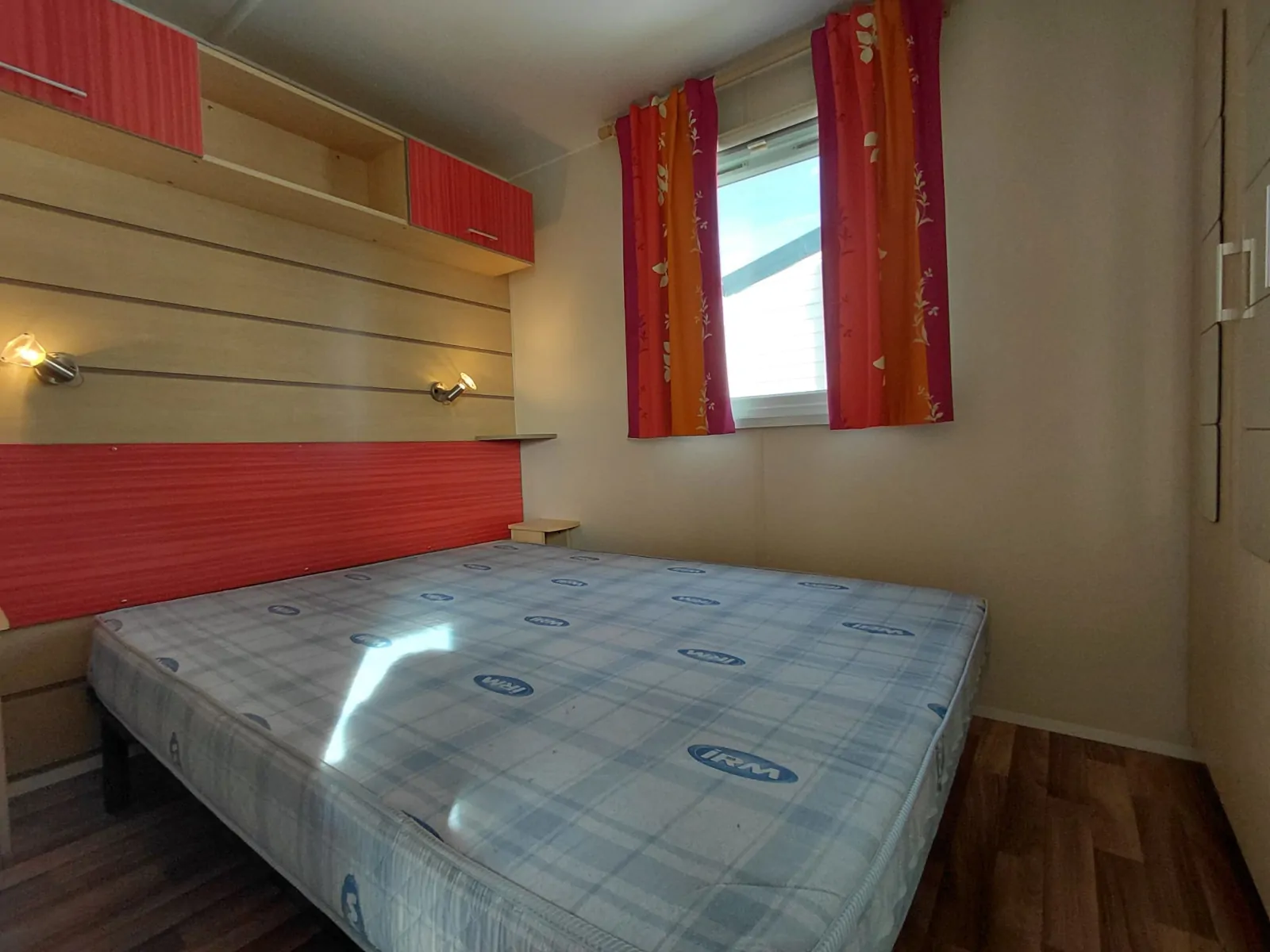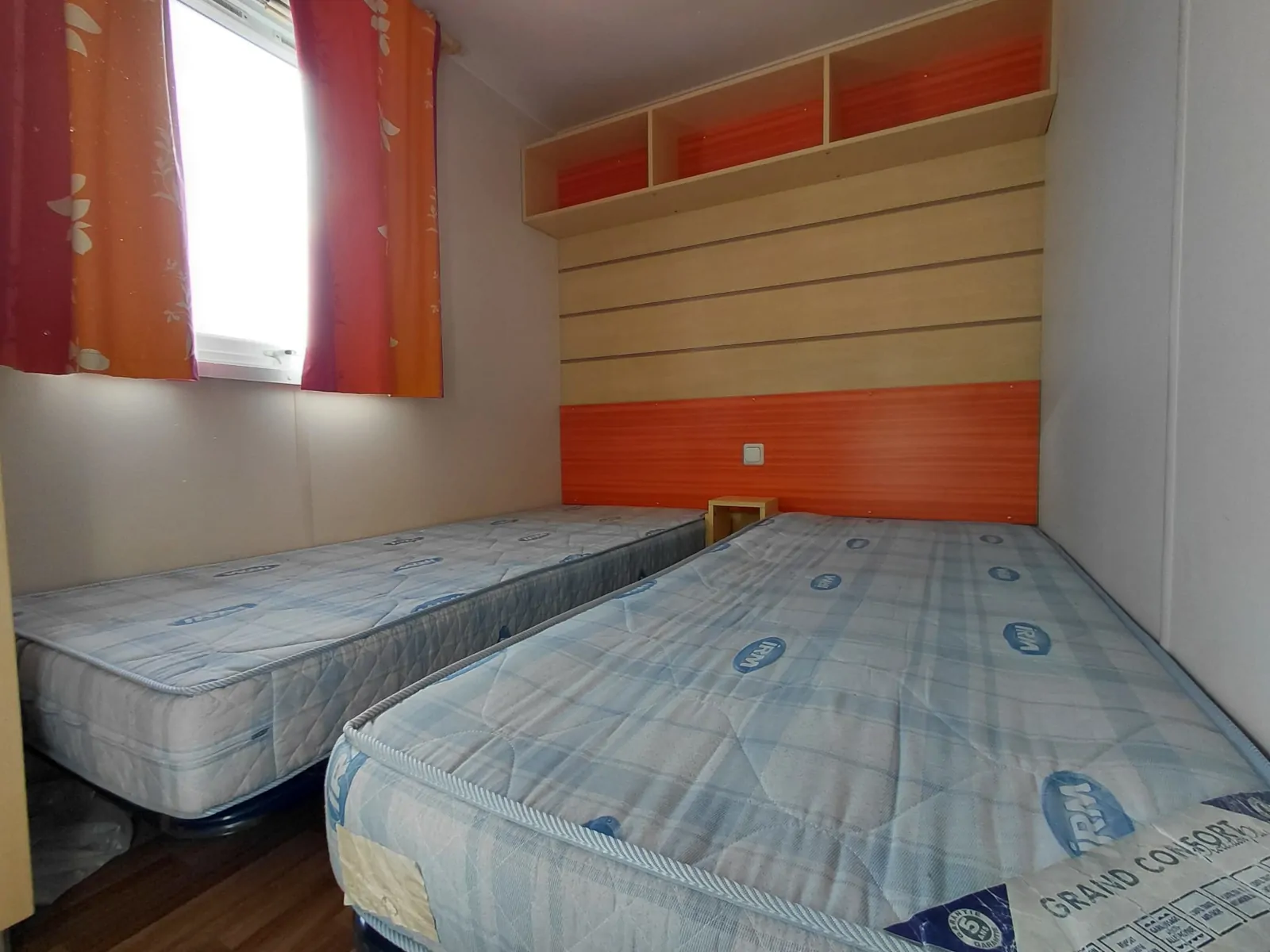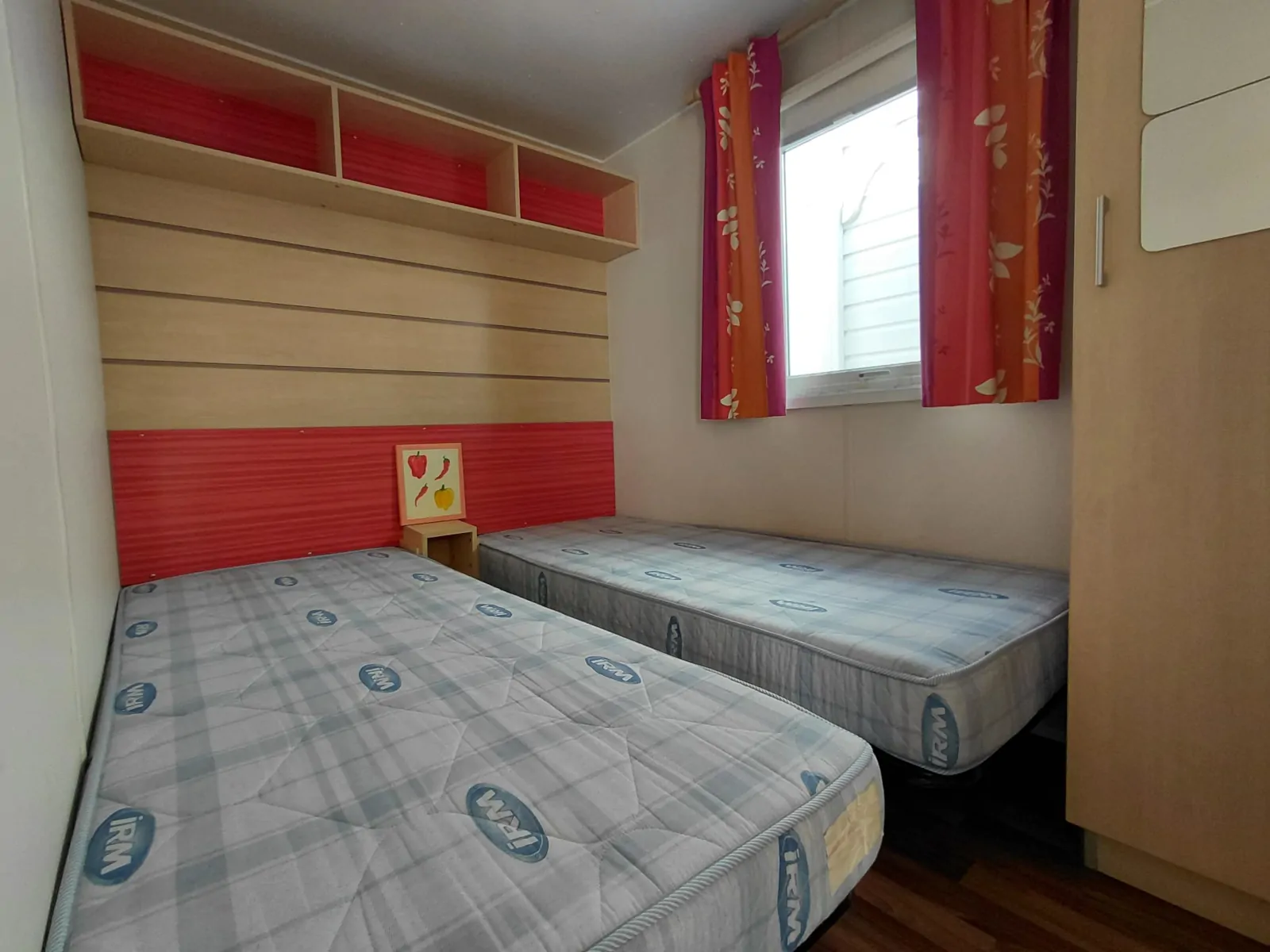 Modern mobile home with three bedrooms, one bathroom, living room and open-plan kitchen. Master bedroom with double bed, two bedrooms with single beds, kitchen equipped with stove, extractor fan and refrigerator.