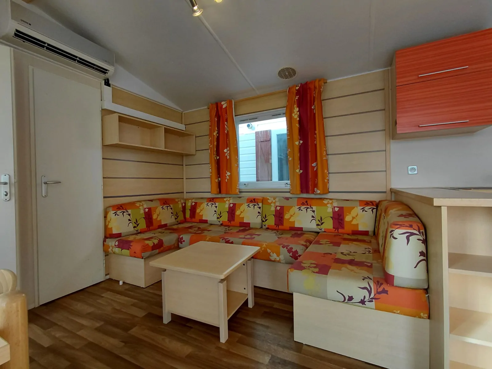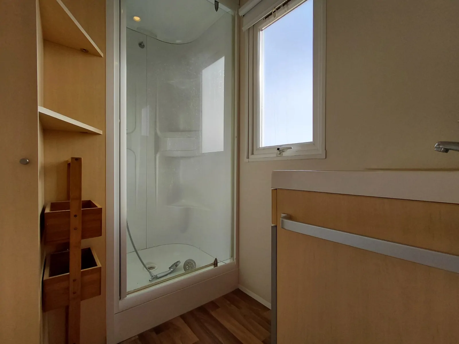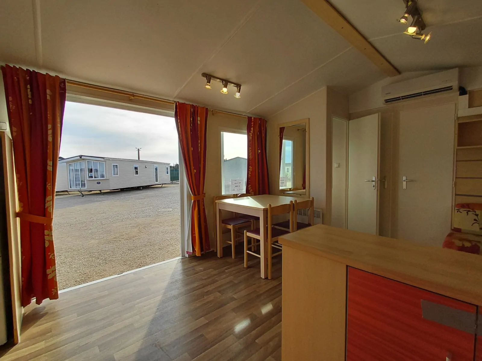Modern mobile home with three bedrooms, one bathroom, living room and open-plan kitchen. Master bedroom with double bed, two bedrooms with single beds, kitchen equipped with stove, extractor fan and refrigerator.