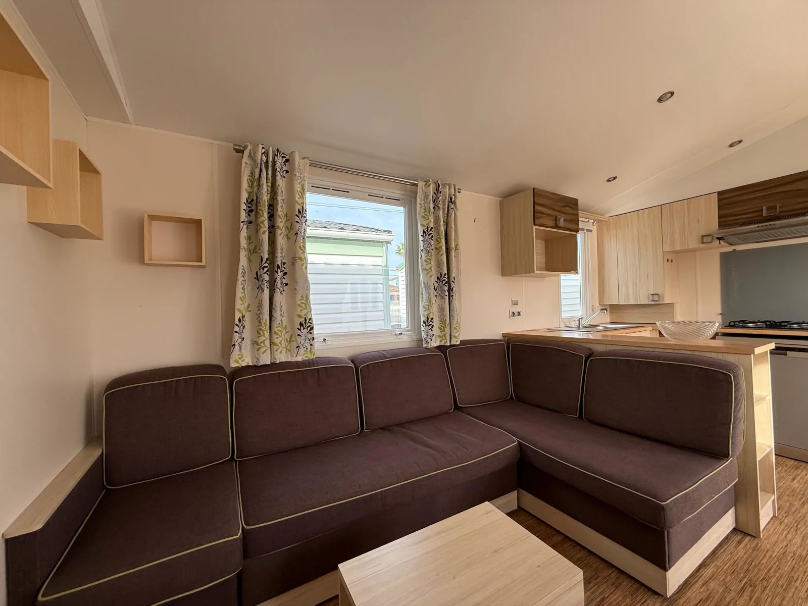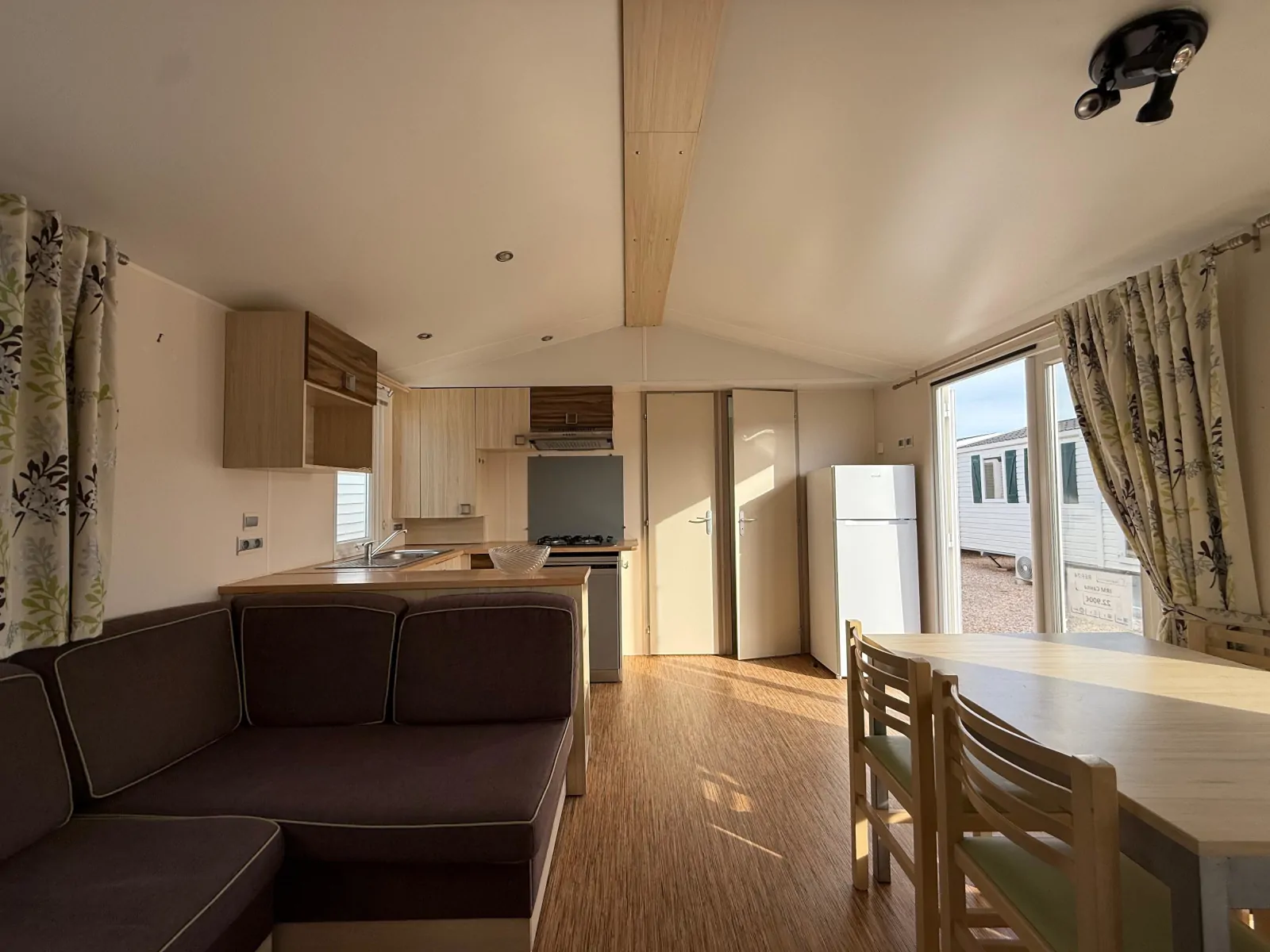 This modern and practical mobile home has an open-plan living room and kitchen, three bedrooms (one with a double bed and two with twin beds), and a bathroom with a shower and cupboard. The kitchen is equipped with a gas hob, extractor fan, fridge, and dishwasher.